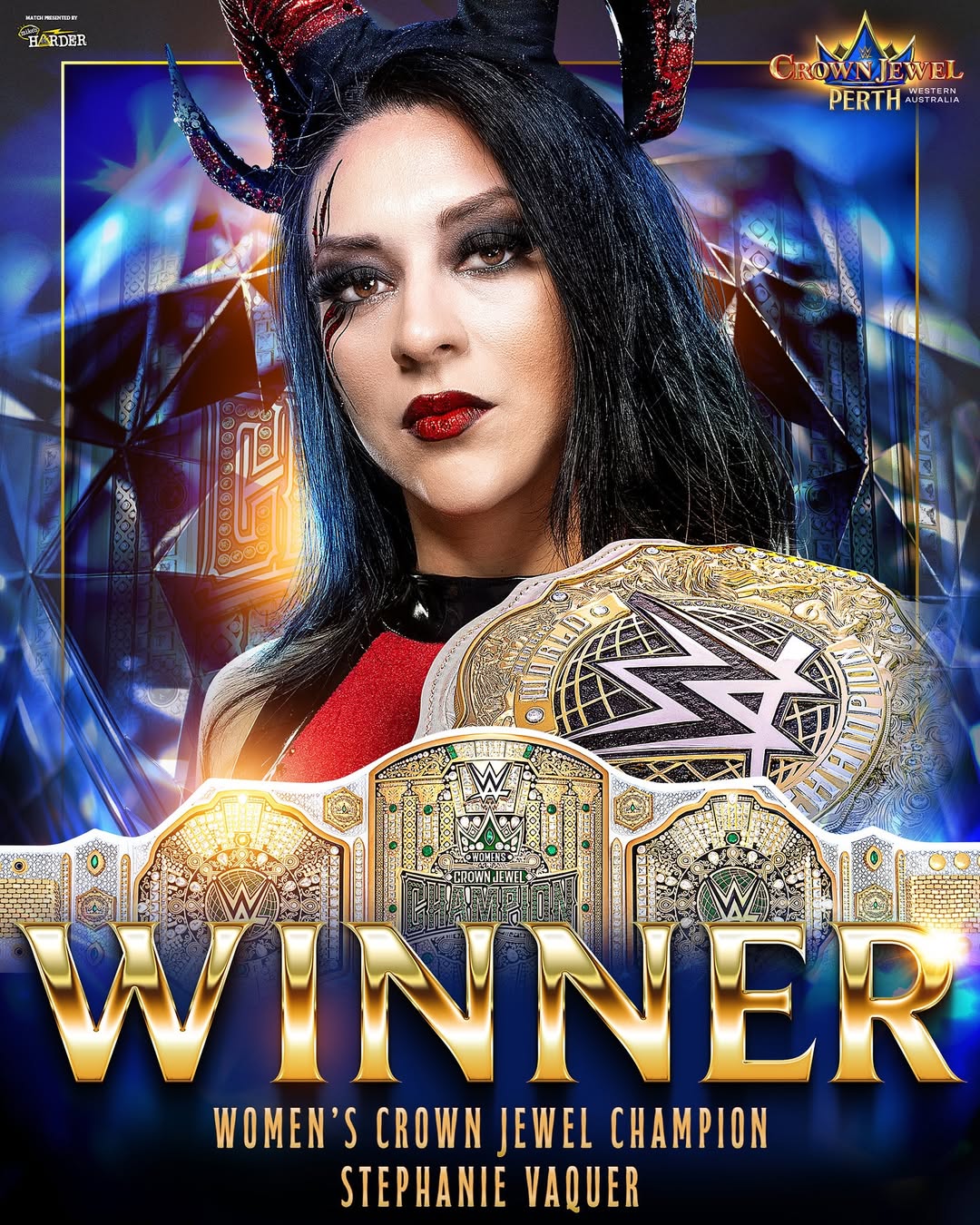 На Crown Jewel 2025 в Перте, Австралия, чемпионка мира WWE среди женщин Стефани Вакер одолела чемпионку WWE среди женщин Тиффани Страттон, став второй обладательницей женского титула Crown Jewel.